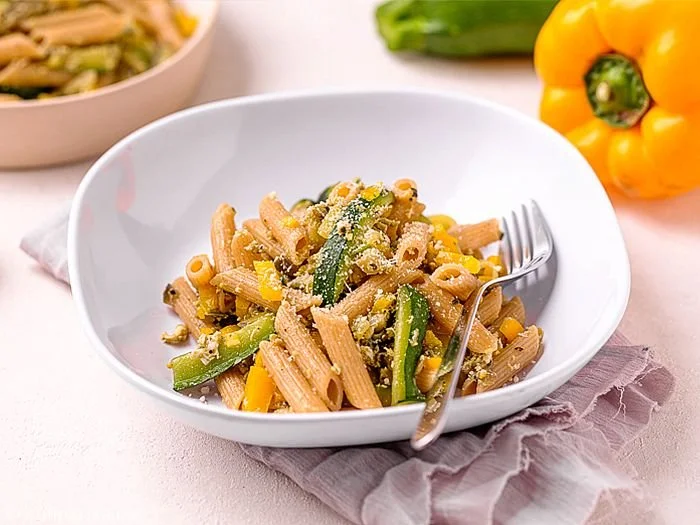 Testenine kuhamo v osoljeni vodi, kot je navedeno na embalaži. Medtem narežemo bučko na ožje trakce. Narežemo tudi čebulo, jajčevec in papriko. Zelenjavo popečemo na oljčnem olju in dodamo začimbe ter vmešano jajce, ki ga pokuhamo, da zakrkne. Ko se testenine skuhajo, jih dodamo omaki, po želji pa dodamo še žlico oljčnega olja. Postrežemo s parmezanom.