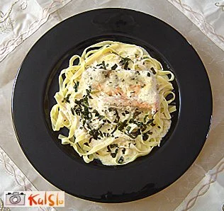 Lososu odstranimo kožo in morebitne koščice in ga na hitro prepražimo na malo olivnega olja z obeh strani. Dodamo džus, vegeto in na drobno sesekljan, svež drobnjak. Ko se džus malo pokuha, zalijemo z vinom in ravno tako pustimo, da alkohol izpari in se omaka nekoliko zgosti. Prilijemo smetano, pokuhamo še 1 minuto in ugasnemo ogenj. Dodamo koščke masla. Omako prelijemo čez testenine, ki smo jih predhodno skuhali v slanem kropu. Obilno potresemo s sveže nasekljano baziliko in serviramo še toplo jed.
