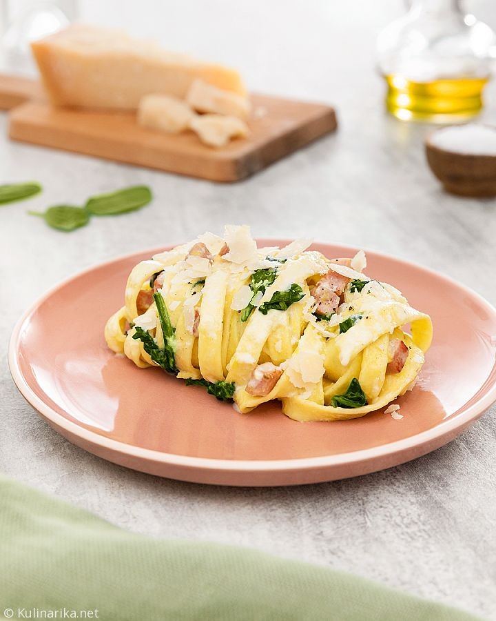 V ponvi prepražite nakockano šunko. Po nekaj sekundah dodajte mlado špinačo in odstavite. Medtem skuhajte rezance v slanem kropu. Ko so testenine kuhane al dente, jih odcedite in popražite v ponvi z omako. Postrezite z nekaj rezinami parmezana.