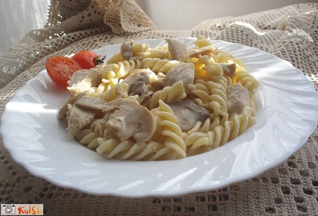 Puranje meso narežemo na kocke in na žlici olja prepražimo, da malo porjavi. Dodamo začimbe po okusu (lahko samo sol, lahko še druge začimbe, jaz dam vegeto). Dodamo na lističe narezane šampinjone (jaz dam sveže, lahko tudi odcejene iz slanice). Še malo prepražimo, tekočina, ki jo spustijo šampinjoni, naj povre. Potem zalijemo s smetano. Dodamo še olupljene sirčke in premešamo, da se sirček raztopi. Potem dodamo svedrčke in premešamo, še malo pokuhamo, da se omaka malo zgosti.