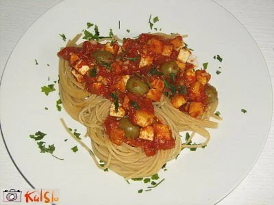 Tofu narežemo na majhne koščke in jih v voku z malo olivnega olja popečemo. Dodamo olive in pelate ter solimo. Omaka naj se nam zgosti, nato dodamo sesekljan česen in dve žlički vode. Premešamo, dosolimo in polijemo preko kuhanih testenin. Okrasimo s peteršiljem