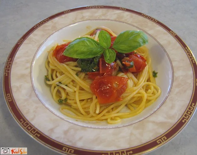 prvinskost okusov paradižnika, bazilike in česna - jed, katere priprava traja toliko, kolikor je potrebno, da se skuhajo špageti