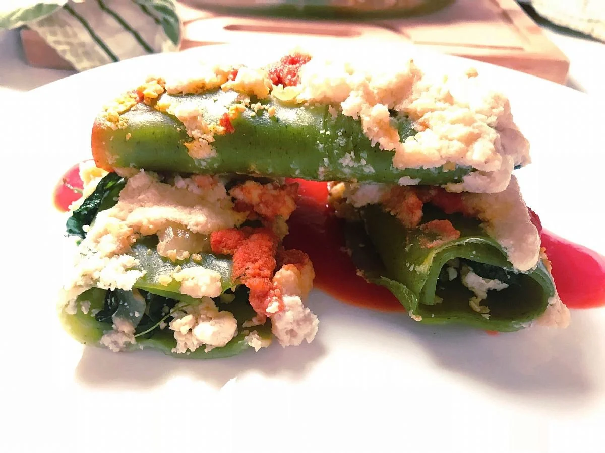 2. Lističe vzamemo iz vode in pripravimo kanelone: na začetek lističa dodamo 1 zvrhano žlico pripravljene omake (tofu + špinača) in zvijemo v zvitek. Ponavljamo, dokler nam ne zmanjka lističev. Če omaka ostane, jo na koncu polijemo po vrhu kanelonov.