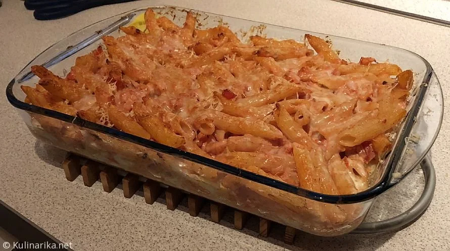 2. Testenine odcedimo in zmešamo z narejeno omako. V pekač najprej zložimo polovico testenin z omako, nato polovico naribanega sira, ter čez to še preostanek testenin z omako in za tem sir. Po okusu lahko še po vrhu naribamo parmezan.