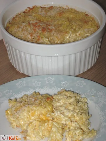 Namastimo pekač, posebej skuhamo makarone v slani vodi, ki smo ji dodali olivno olje (6-7 min), nato jih odcedimo in stresemo nazaj v posodo. Medtem v kozici stopimo maslo, dodamo česen, ki ga pražimo 1-2 minuti in prelijemo makarone. V veliki skledi zmešamo toplo mleko, sladko smetano, Ricotta sir (skuto), moko in Worchestersko omako. V drugi skledi pa dobro zmešamo parmezan in oba sira. Sestavine obeh skled ter stepeno jajce prelijemo prek makaronov, posolimo, popramo, nežno premešamo ter pretresemo v pekač.