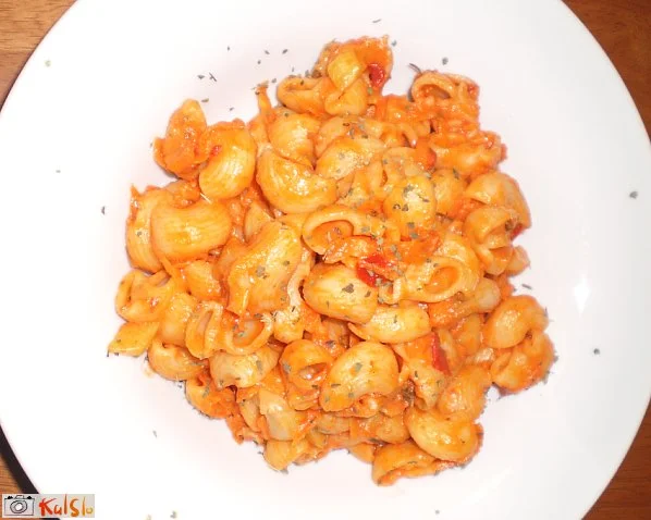 Zraven ponudimo solato. Jaz ponavadi kar rdečo peso, ker pogosto naredim te testenine ko se mi zelo mudi in kosilo imam gotovo res v desetih minutah.