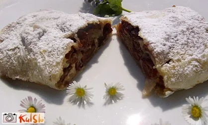 Tale zavitek na sliki je iz zmrznjenih češenj, seveda predhodno odmrznjenih, tako, da brez bojazni preizkusi. Za višnje ne vem, ampak, če rimljanka pravi, da je še bolje, bo že držalo. Predvidevam, da je malo bolj kiselkasto. / katti