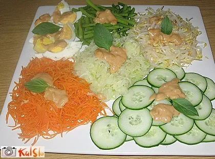 Krompir narežemo na rezine, damo v posodo in dolijemo toliko vode, da je pokrit ter ga skuhamo. Odcedimo ga in pustimo, da se ohladi. Korenje olupimo in narežemo na kolobarje (ali na trakove a la julienne) ter ga blanširamo. Snake beans ali stročji fižol narežemo na nekaj cm dolgo in prav tako blanširamo. Zelje drobno zrežemo ali naribamo in tudi blanširamo. Zelenjavo po blanširanju dobro odcedimo in pustimo nekaj časa v ledeno mrzli vodi, da obdrži lepo barvo.