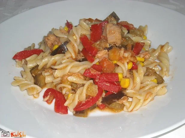 Testenine z melancanami in tunomelancane, tuna, rdeča paprika, paradižnik, koruza, česen