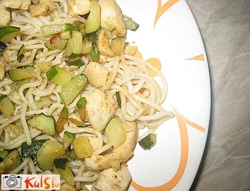 Kitajski rezanci s piščancem in bučkamiPoslovenjena kitajska jed.