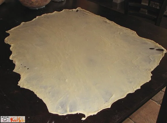 Damo ga na desko, namažemo z oljem in pokrijemo s plastično vrečko, da ne nastane skorja. Dlje ga pustimo, lažje se vleče, lahko ga na hladnem pustimo tudi čez noč, le da ga pred uporabo nekaj časa postavimo na toplo. Se zelo tanko razvleče.