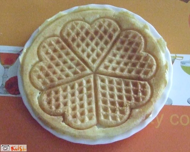 Testo je zelo tekoče in hitro se lahko zgodi, da ga v pekač vlijemo preveč in med peko steče čez rob. V mojem pekaču (Eltin pekač v obliki rožice, sestavljene iz 5 srčkov) za en vafelj zadošča ena zajemalka testa (približno pol decilitra).