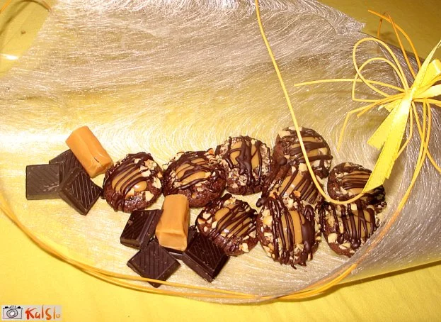 Iz masla, sladkorja, kakava, moke, rumenjakov in smetane zgnetemo testo in ga damo za najmanj 2 uri v hladilnik, da počiva. Nato iz testa izoblikujemo kroglice velikosti oreha in v vsako z ročajem kuhalnice naredimo luknjo (kot pri huzarskih krapkih). Vsako kroglico z zgornjim delom pomočimo v rahlo stepen beljak in nato v lešnike. Pečemo cca 10-15 minut na 180 stopinjah. Ko so piškotki ohlajeni, luknjice zapolnimo s tekočo karamelo; nad soparo raztopimo smetanove karamele s smetano. Ko se karamela nekoliko strdi, piškote okrasimo še s črticami iz temne kuverture.