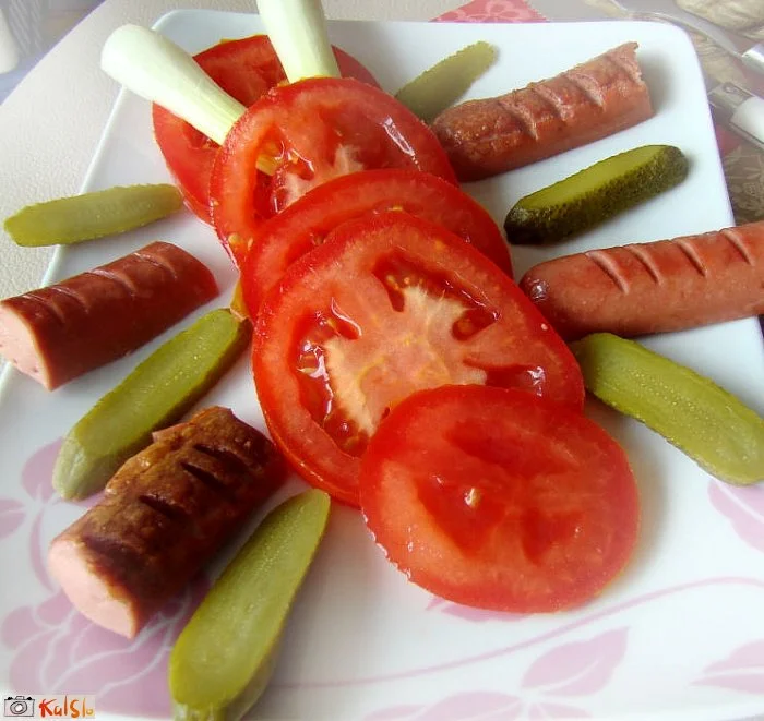 Klobasice prerežemo na pol in jih popečemo na malo olja. Serviramo jih s paradižnikom, kumaricami in mlado čebulo.