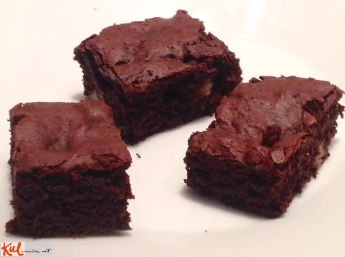 Pečico segrejemo na 170 stopinj. V večji kozici nad blagim ognjem stopimo maslo. Odstavimo in dodamo na kose nalomljeno čokolado. Z metlico premešamo. Ko se čokolada stopi, dodamo sladkor in presejan kakav. Dobro vmešamo vsako jajce posebej. Dodamo ščepec soli in presejano moko s pecilnim praškom. Masa mora biti gosta, brez grudic in sijoča. Na koncu dodamo nasekljane orehe ali lešnike. Maso zlijemo na s peki papirjem obložen in z maslom namazan nizek pekač, cca. 40x40 cm. Pečemo 25 - 30 minut. Pazimo, da peciva ne prepečemo! Ohlajeno narežemo na poljubno velike kose. Postrežemo s sladko stepeno smetano.