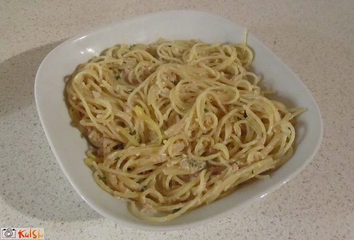 V ponev odcedimo olje iz konzerve za tuno. Na malo segretem olju prepražimo zelo na drobno sesekljan česen, da porumeni. Dodamo tuno, prepražimo in nato zalijemo z dl vina. Dodamo polovico goveje kocke, kislo smetano, sirček, poper. Čisto na koncu dodamo na drobno nasekljan peteršilj in zalijemo s preostankom belega vina. V omako dodamo predhodno kuhane špagete in jih pustimo 2 minuti, da se prepojijo z omako. Po želji dodamo parmezan.