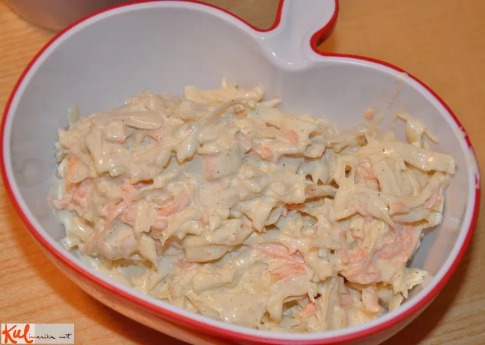 Zeljno glavo naribamo ali narežemo na drobno, dodamo naribano korenje in prav tako nariban hren. Malo premešamo. Dodamo majonezo, gorčico, kis, sol in poper po okusu.