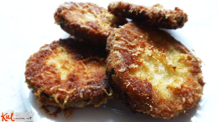 400 g bučk oplaknemo, obrišemo in obrežemo na koncih. Narežemo jih na pol centimetra debela kolesca. Solimo in popopramo. Rezine bučk z obeh strani povaljamo v moko. V globokem krožniku stepemo 1 jajce in 3 žlice vode. Na plitev krožnik naribamo parmezan in primešamo drobtine. Bučke povaljamo v jajce in nato v drobtine s parmezanom. Drobtine rahlo pritisnemo, da se bolje primejo. V ponvi razgrejemo olje. V njem ocvremo bučke. Odcedimo jih na plasti papirnatih brisač.