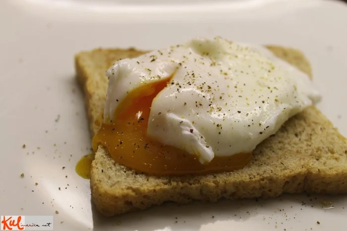 Zavremo vodo in ji dodamo 2 žlici kisa. Vodo pustimo, da vre na najnižji temperaturi, nato pa vanjo spustimo jajce. Kis bo pomagal, da se bo beljak lepo zaokrožil okrog rumenjaka. Kuhamo 4 minute in jajce poberemo ven z žlico. Pazimo, da ne kuhamo predolgo, ker jajčni rumenjak v tem primeru na bo več tekoč, kar je bistvo poširanega jajca.