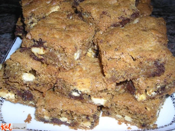 Blondiji, da te kapsvetli browniji z belo čokolado, indijskimi oreščki, temno čokolado in kokosom
