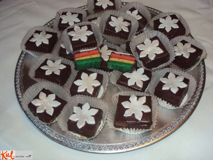 Pečeno testo pustimo, da se ohladi, potem pa ločimo posamezne plasti. Marmelado z vodo segrejemo. Namažemo polovico marmelade čez zeleno testo, na njo položimo belo, namažemo še to in nanjo položimo rdeče testo. Pustimo, da počiva najmanj štiri ure ali pa še več. Razrežemo.