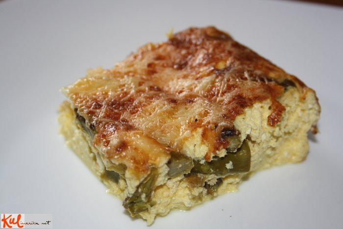 Srednje velik pekač namažemo z maslom. Vlijemo skutino mešanico in potresemo s praženimi šparglji. Na koncu posujemo z naribanim parmezanom.