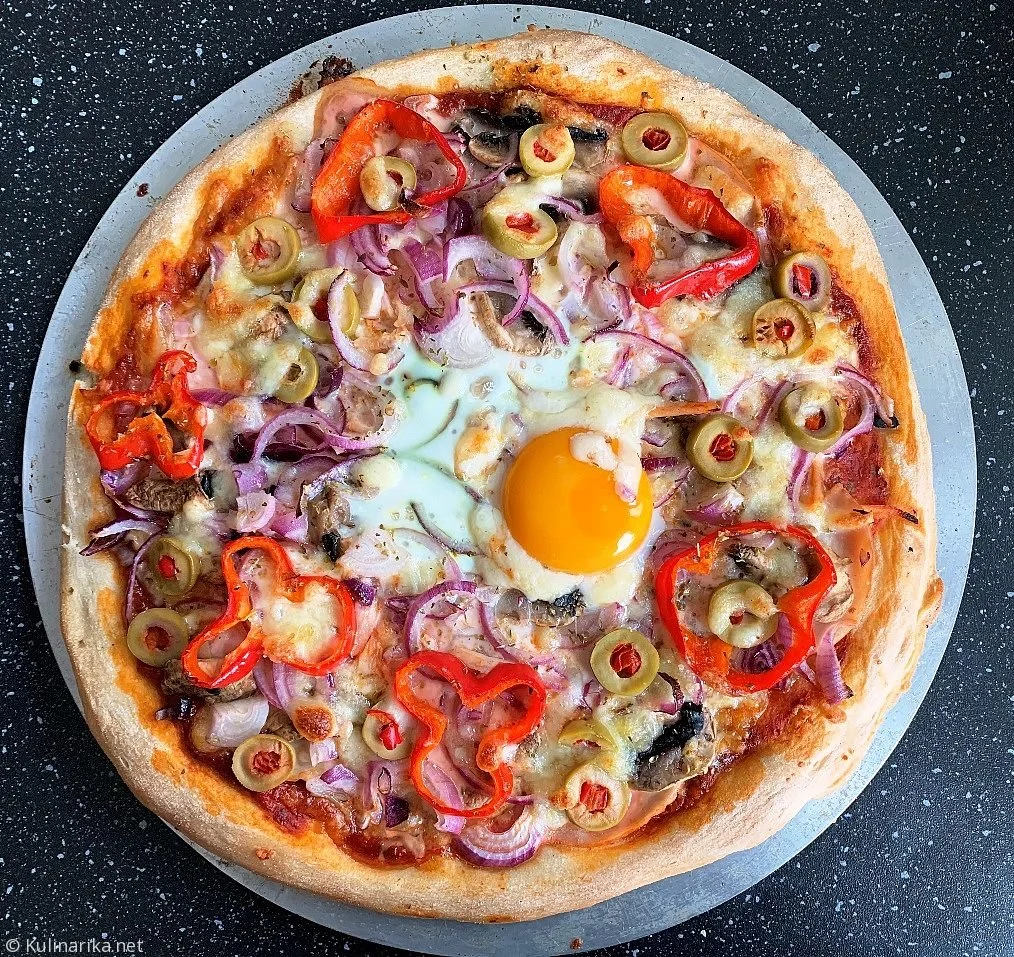 Testo najprej namažemo s paradižnikom, ga posujemo z origanom, nanj začnemo zlagati šunko, na šunko suho salamo, naribamo sir, nanj naribamo čebulo in dodamo narezane šampinjone. Nazadnje naložimo olive. Ko smo pico pripravili, jo postavimo v že naprej segreto pečico na 180-200 stopinj, ventilatorsko gretje. Po 15 minutah pico vzamemo iz pečice, nanjo ubijemo jajčka po želji in pečemo še 3 minute.