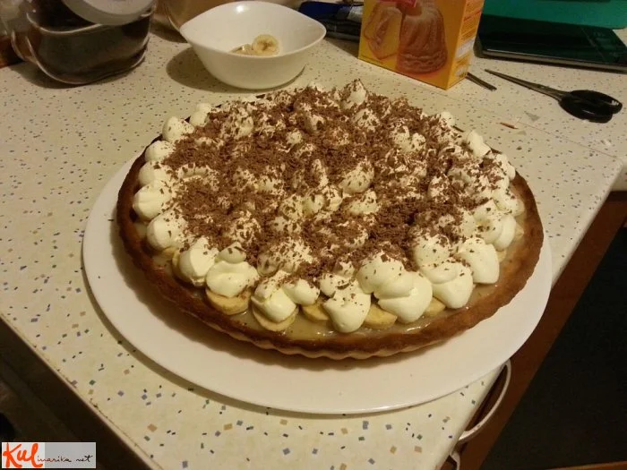 Karamelo vlijemo na pečeno testo in jo ohladimo. Na kolobarje narezane banane razporedimo po karameli in okrasimo s stepeno smetano ter nastrgano čokolado.