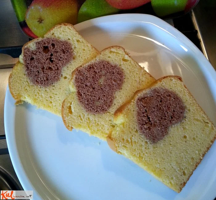 cela jajca penasto umešamo s sladkorjem. Primešamo maslo, nato pa še vse ostale sestavine. Približno 1/3 mase vlijemo na dno dobro namaščenega pravokotnega pekača dimenzij 30 x 11 cm. Nanjo zložimo kolono kakavovih srčkov, ki smo jih izrezali iz rjavega biskvita. Srčki se morajo tesno stikati. Čez kolono srčkov nato zlijemo preostalo polovico rumene mase. Pečemo v predogreti pečici brez ventilacije pri 170 stopinjah 50 minut.