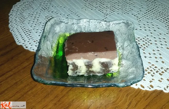 3. Skuhamo čokoladni puding, vmešamo maslo, ter previdno polijemo po strjenem vanilijevem pudingu.