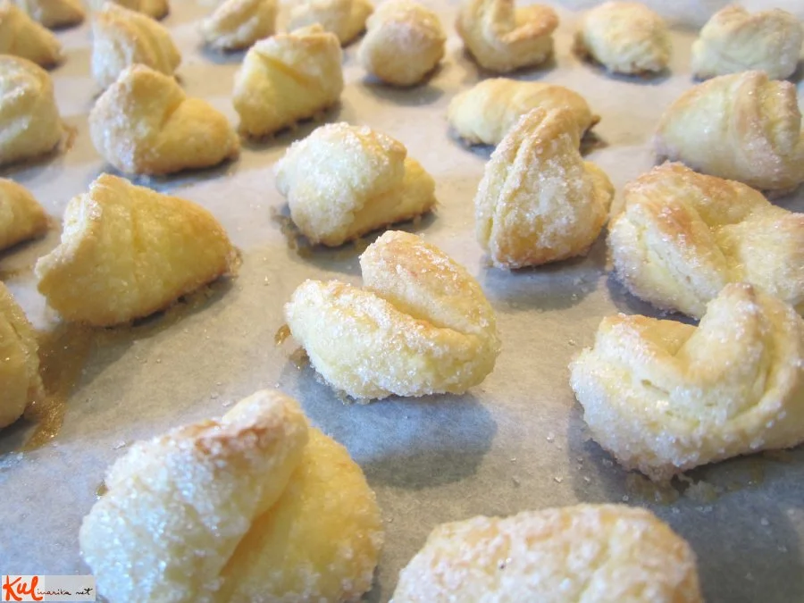 Recept sem dobila na hrvaški kulinarični strani in s soglasjem avtorice ga objavljam. Če izrezujem krog s kozarcem, rob kozarca pomokam z moko... tako se testo, ki vsebuje kar nekaj masla, ne prime na kozarec.
