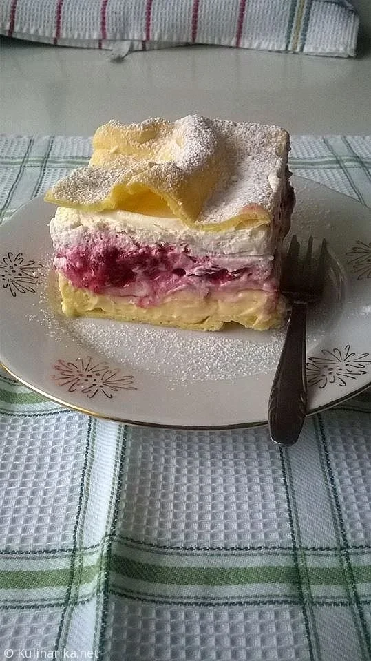 Pecivo sem najprej videla na drugem portalu, ampak je ok, da je tudi v bazi receptov na Kulinariki. Šlo bi tudi z listnatim testom, ampak je vredno poizkusit testo iz recepta. Testo sem pekla dve minuti predolgo, tako da predlagam pozornost pri času peke testa. Ko ugasnemo pečico, je testo fino par minut še pustiti v njej, da prehitro ne upade. V pudingovo kremo sem dala manj masla (od 250g sem dala 125g v testo in 125g v kremo), pa je povsem ok. Sladkorja sem dala v kremo manj, 5 žlic in dva vanilijeva sladkorja. Maline v receptu niso navedene količinsko, uporabila sem jih 500g in je zadostovalo. Sladkorja sem dodala 4 žlice. Smetani sem dodala en vanilijev sladkor in žličko mletega sladkorja. Pečenega zgornjega testa nisem predhodno rezala, ni potrebe po tem. Peciva pride precej. Najbolje ga je jesti dan po tistem, ko smo pripravili. / anka