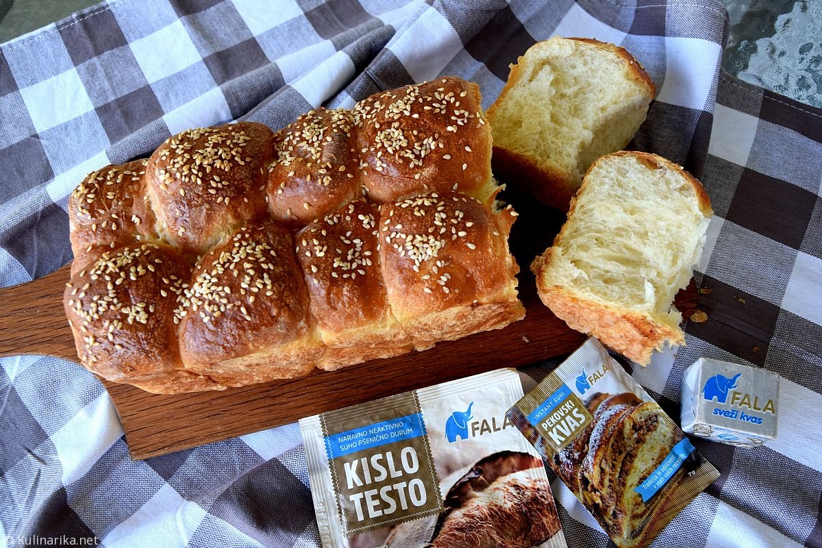 v posodo odmerimo sol, dodamo moko in kislo testo Fala. V vodi raztopimo kvas Fala, ga prilijemo k moki, dodamo vse ostale sestavine brez masla ter ohlajeno paljeno testo. Zamešamo testo in med mešanjem dodamo zmehčano maslo. Na visoki hitrosti mešamo vsaj 15 minut, da postane testo gladko, čeprav precej mehko.