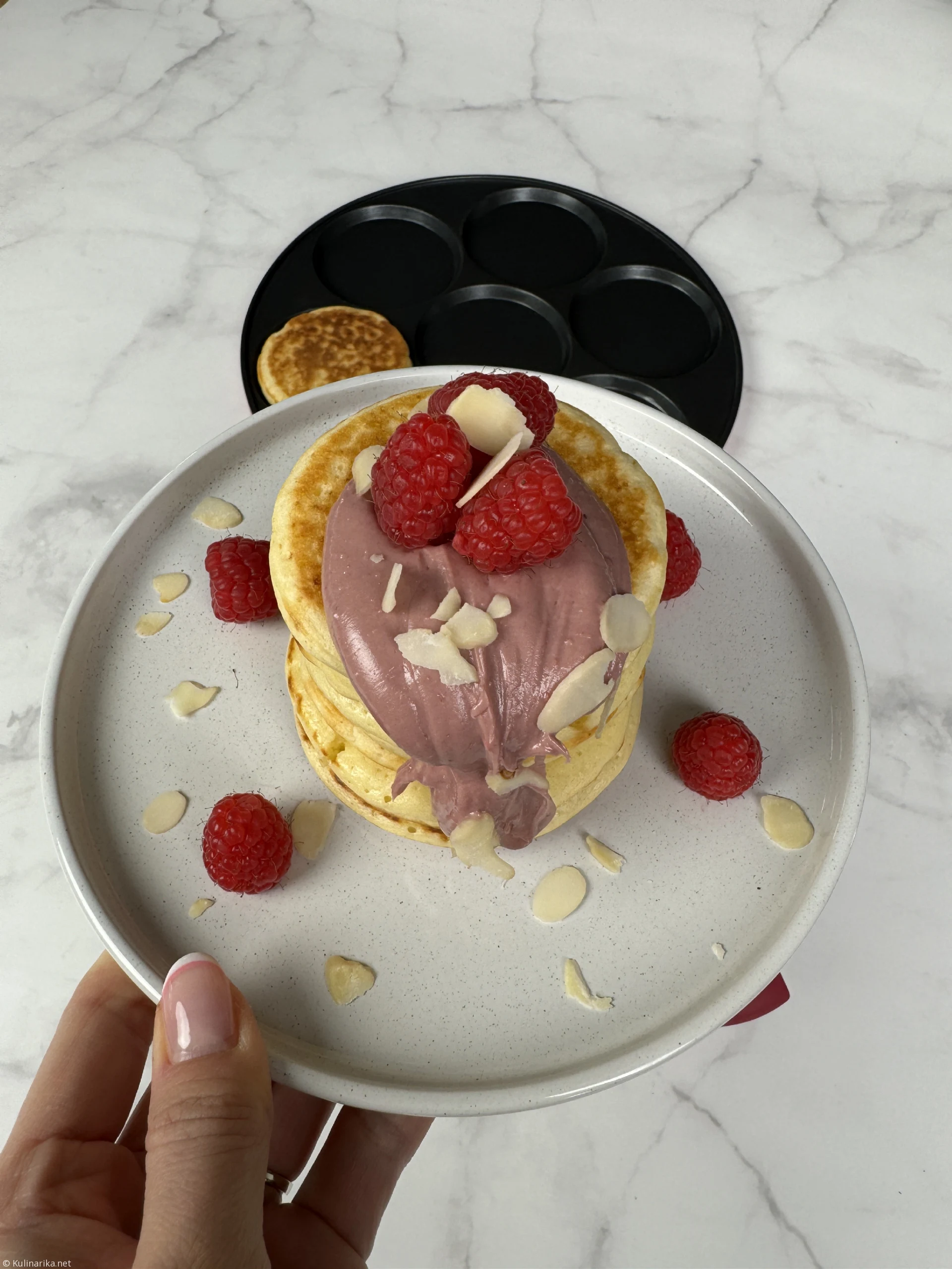 Puhaste mini palačinkeMehke, puhaste in ravno prav sladke mini palačinke s kremnim namazom so odlične za hiter zajtrk ali sladek prigrizek.