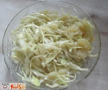 V skledi zmešamo zelje, na rezine narezan krompir, začinimo in premešamo.