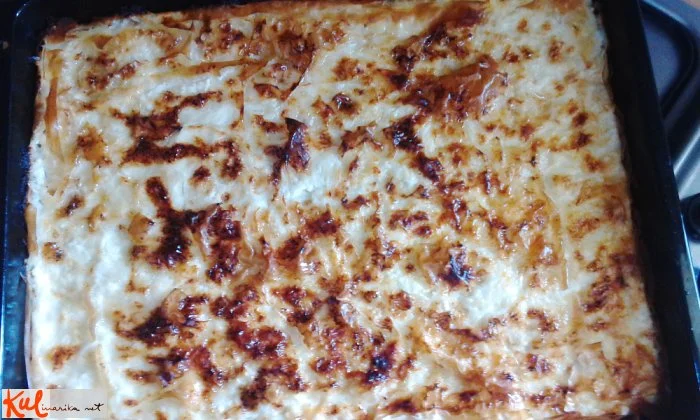 Najprej dobro zamesimo testo, tako da se ne prijema več na roke ali posodo. Testo pustimo počivati približno 10 do 20 minut, nato ga razvlečemo na čim tanjše lističe v velikosti pekača. Pekač dobro naoljimo, položimo vanj list testa, ga naoljimo in položimo še dva lista testa, ki ju prav tako naoljimo in namažemo z nadevom, zopet položimo tri liste testa, pa zopet nadev in tako dokler nam ne zmanjka sestavin. Na zadnji sloj nadeva moramo dati vsaj še dva lista testa.