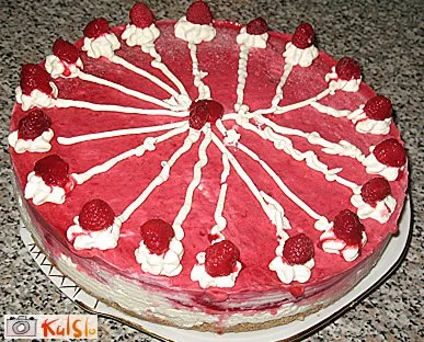 Po mojem malinin pire vmešamo v kremo, da dobi tak marmornat videz, po mojem ga lahko tudi z vilco. rolada, na sliki se lepo vidi, da je torta upognjena, ker je krožnik malo globok. Ti si lahko torto narediš tako, da bo všeč tebi. / matilda