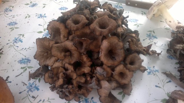 (Craterellus cornucopioides). Glej tudi TROBENTE. Goba z značilno črno ali temno sivo barvo nima izrazitega vonja, nekoliko diši po milu, skoraj bi rekli, da je plehka. Kljub temu je zelo cenjena goba in jo uvrščamo v 2. jedilni razred. Ker je krhka, je treba z njo ravnati previdno, da se ne zdrobi. Očistiti jo moramo skrbno, ker je dostikrat umazana. Črna trobenta je okusen dodatek juham, omakam, prikuham, zelo dobra je v rižoti, jajčnih jedeh, nadevih, paštetah in v solati. Nekateri gobarji z njo nadomeščajo redko in drago gomoljiko (ustreza po barvi, a ne po okusu). Pogosto jo mešamo z drugimi gobami. Odlična je posušena in zmleta v prah, ki ga dodajamo juham, omakam, mesnatim in močnatim jedem. Dodajamo jo šele tik preden postrežemo. Iz črnih trobent naredimo izvrsten gobji izvleček.