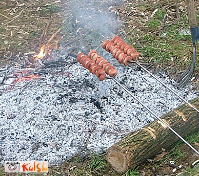 Matjaž ,povem še svojo verzijo priprave -nabodala si naredimo kar v gozdu iz vej ,navadno klobaso oziroma "pesjko radost"kot ji mi pravimo, približno 10 cm dolgo klobaso malo vodoravno zarežemo in potem si vsak svoj ražnjič z klobaso peče -včasih pa si tudi že dan prej domo v marinado svinjino in si pečemo ražnjiče -seveda vsak zase ,si pa tudi kruh nabodnemo na nabodala in ga nad žerjavico hrustljavo zapečemo natremo z česnom, pa zraven klobasa .............hrana za Bogove .