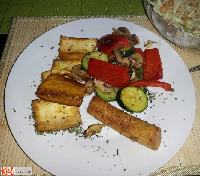 2. Vse našteto in sojino hrenovko damo z malo olivnega olja v ponev in popečemo - začinimo z mediteranskimi začimbami in žlico sojine omake (dodamo med peko, vendar tik pred koncem).