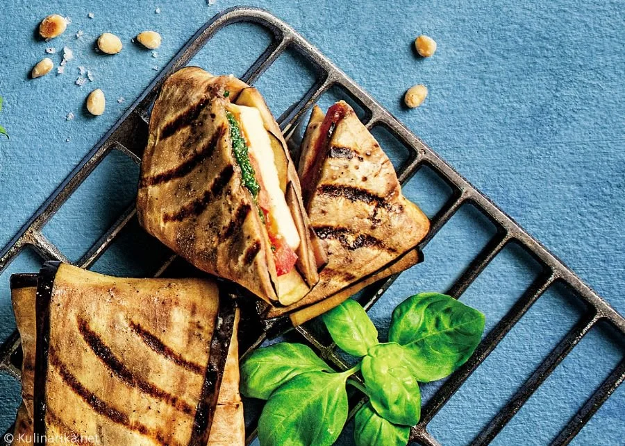 2. Po dve rezini jajčevca prekrižamo, na sredino položimo mocarelo s paradižnikom, konce jajčevca pa preložimo enega čez drugega, da oblikujemo lep paketek. Prebodemo ga z zobotrebcem, da se med peko ne odvije. Nato ga položimo na žar in na vsaki strani pečemo približno 3 minute.