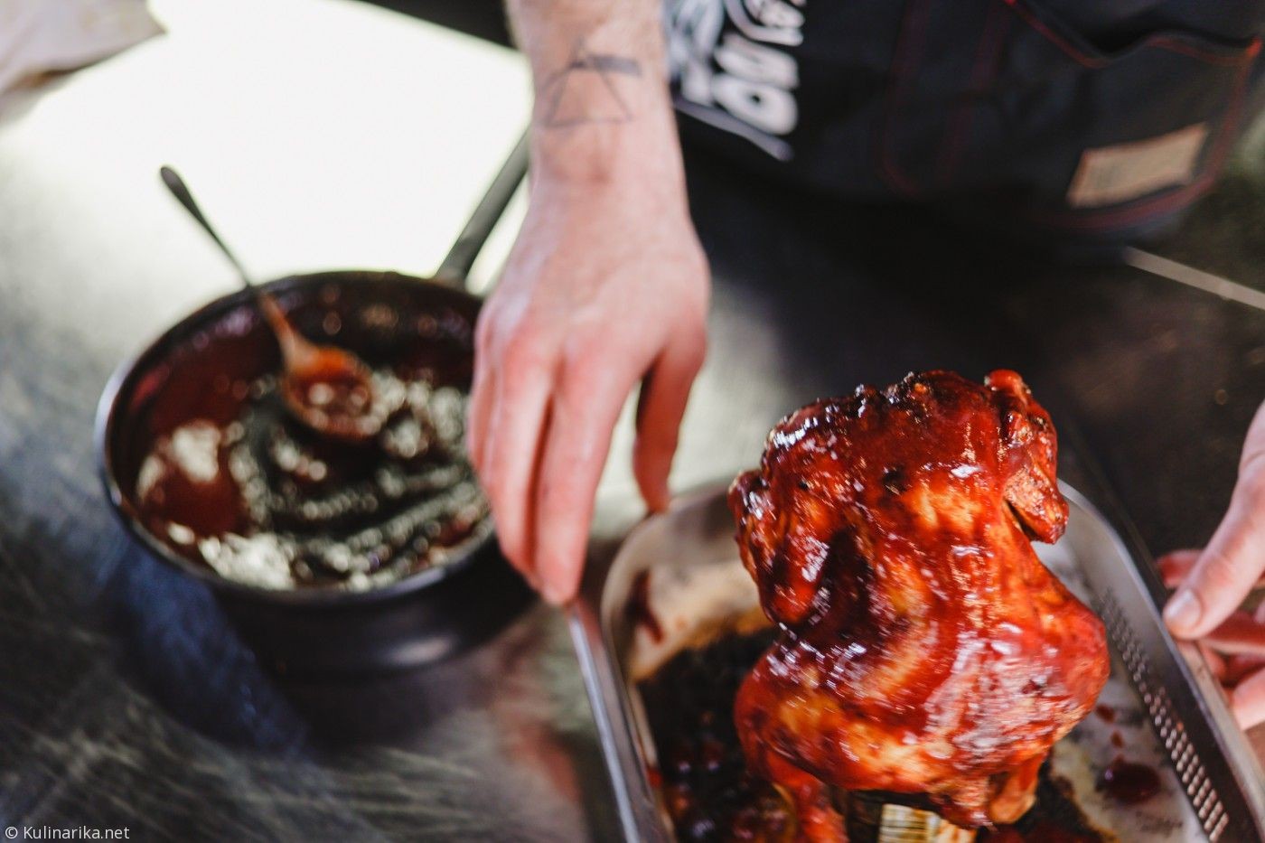 Po eni uri kuriko vzameš iz pečice jo premažeš z marinado, najbolje s čopičem, da se ne popečeš. Če si bolj hrabre, utrjene narave, lahko tvegaš dotik kože na kožo. Pečeš še dodatnih 30 min.