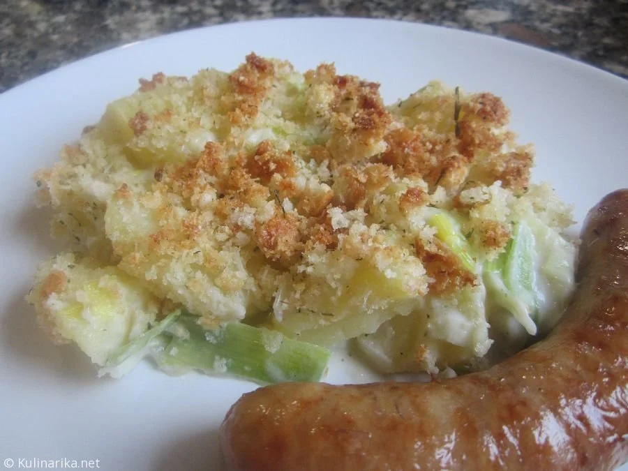 1. Krompir olupimo in ga, če je večji, narežemo na pol, oziroma na tri dele. Delno ga skuhamo v slani vodi, da je na pol kuhan. V posodi stopimo maslo in podušimo na rezine narezan por, solimo in popramo. Po približno 5 minutah kuhe potresemo z moko, pomešamo in kuhamo kakšno minutko. Nato prav počasi dolivamo mleko, da nam ne nastanejo grudice, s tem dobimo približek bešamel omaki s porom.