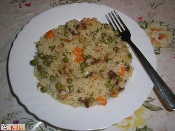 V slani vodi skuhamo riž in narezan korenček. Popečemo na tanko zrezano panceto in ji odcedimo mast. Vse sestavine, tudi grah, damo v skledo, dodamo razstopljeno maslo, premešamo in ponudimo z mesom in solato.
