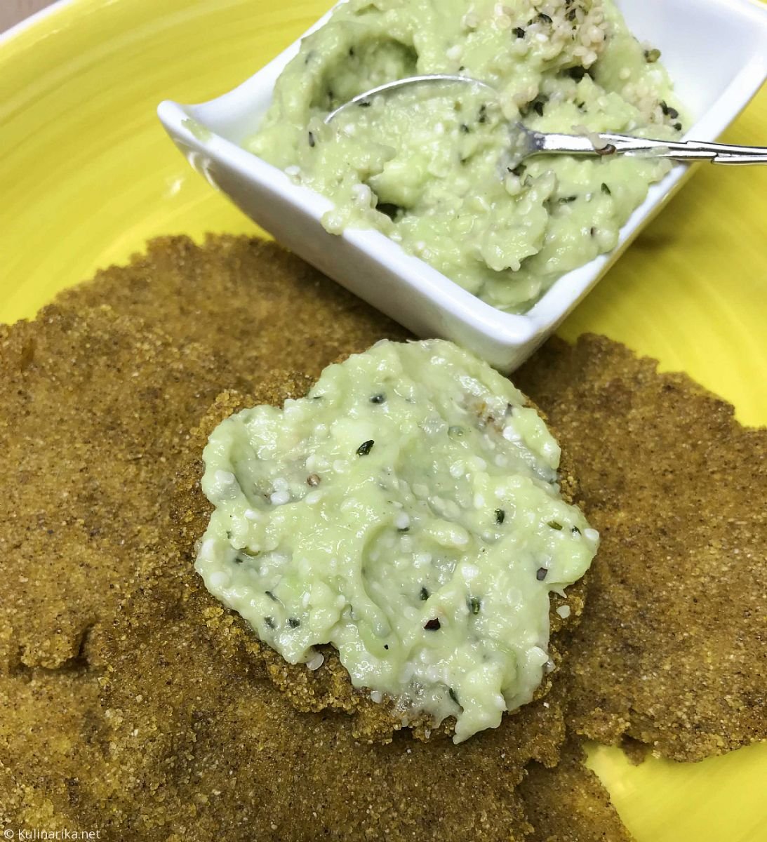 1. V posodo damo avokado, dodamo limonin sok, sol in poper. Vse skupaj zmešamo in pretlačimo. Dodamo oluščena konopljina semena, še enkrat vse skupaj zmešamo in namaz je pripravljen.