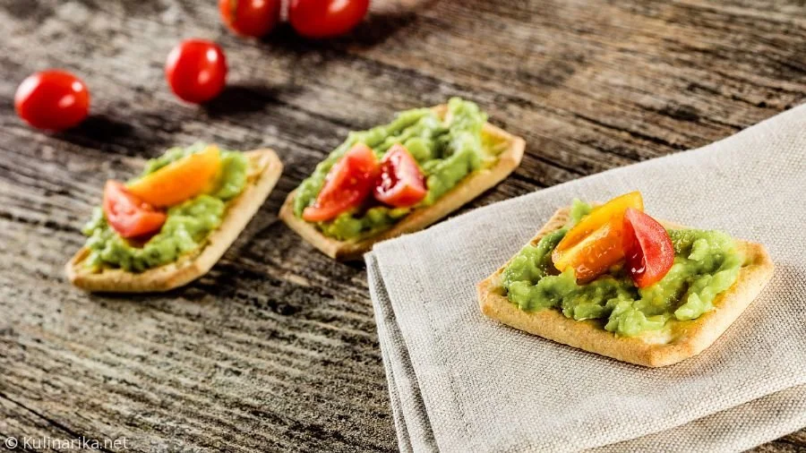 5. Gvakamole namažemo na krekerje Snackers in jih okrasimo s paradižniki. Pokapamo še z nekaj kapljicami omake iz balzamičnega kisa ali jo postrežemo ob jedi.