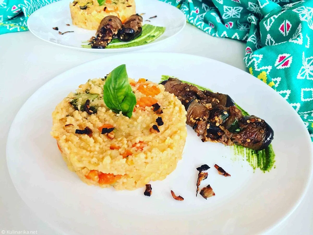 Kuskus z zelenjavo in popečenimi jajčevci na špinačnem pestuenostavno, hitro in polno okusov