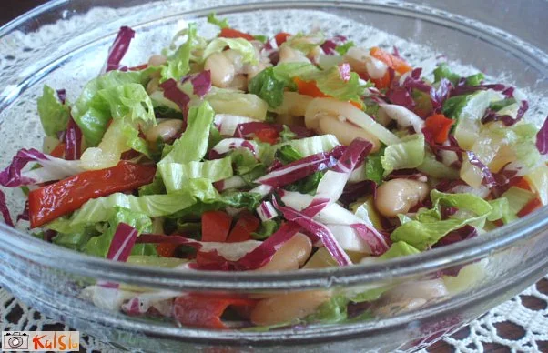 4Zelenjavo dobro operemo in narežemo na trakove, olive izkoščičimo in narežemo na kolobarčke, meso očistimo in narežemo na kockice, solimo, popramo, zabelimo z olivnim oljem, vinskim kisom in vodo.