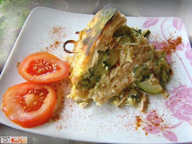 Bučke popečemo na malo olja, jih solimo, popramo in dodamo mleto papriko. Lahko dodamo tudi poljubne začimbe. Skuhamo testenine. Pripravimo ognjevarno posodo. Jo namažemo z oljem (dno) in nalagamo eno plast testenin ter plast bučk, nato polijemo s polivko (kisla smetana, 3 jajca in 2 žlici vode). Nadaljujemo s plastmi. Zadnja plast naj bodo testenine, ki jih polijemo s polivko in damo gor 3 lističe sirčka za toast. Posujemo z malo mlete paprike. Pečemo v pečici 30 minut na 200 stopinj oz. toliko, da se sirček malo zapeče. Postrežemo s skledo paradižnikove solate.