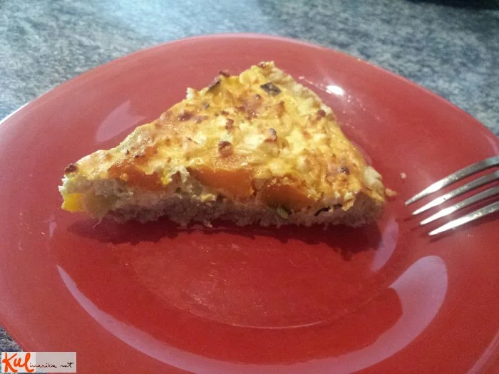 slana pita iz pirinega ali rženega testa s skuto, feta sirom, porom in hokaido bučo